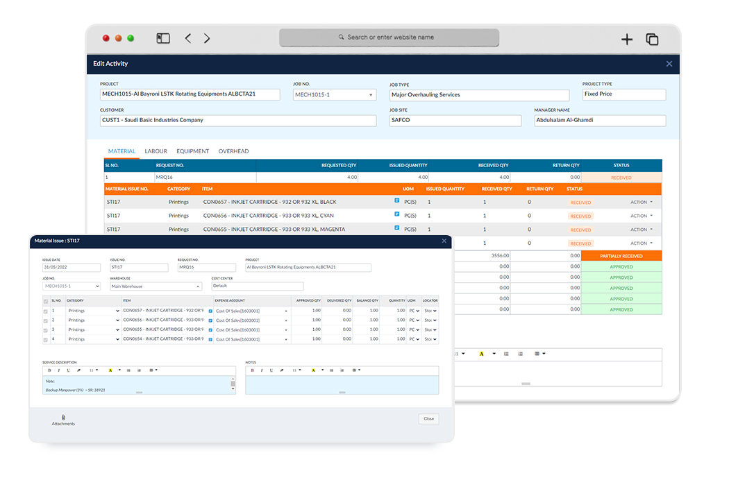 شاشة نشاط العمل تعرض جميع المعلومات المتعلقة بكل مهمة مثل المواد المستخدمة، والفنيين المجدولين، كما تسجل ساعات العمل مدفوعة الأجر بدقة، والكثير غير ذلك.